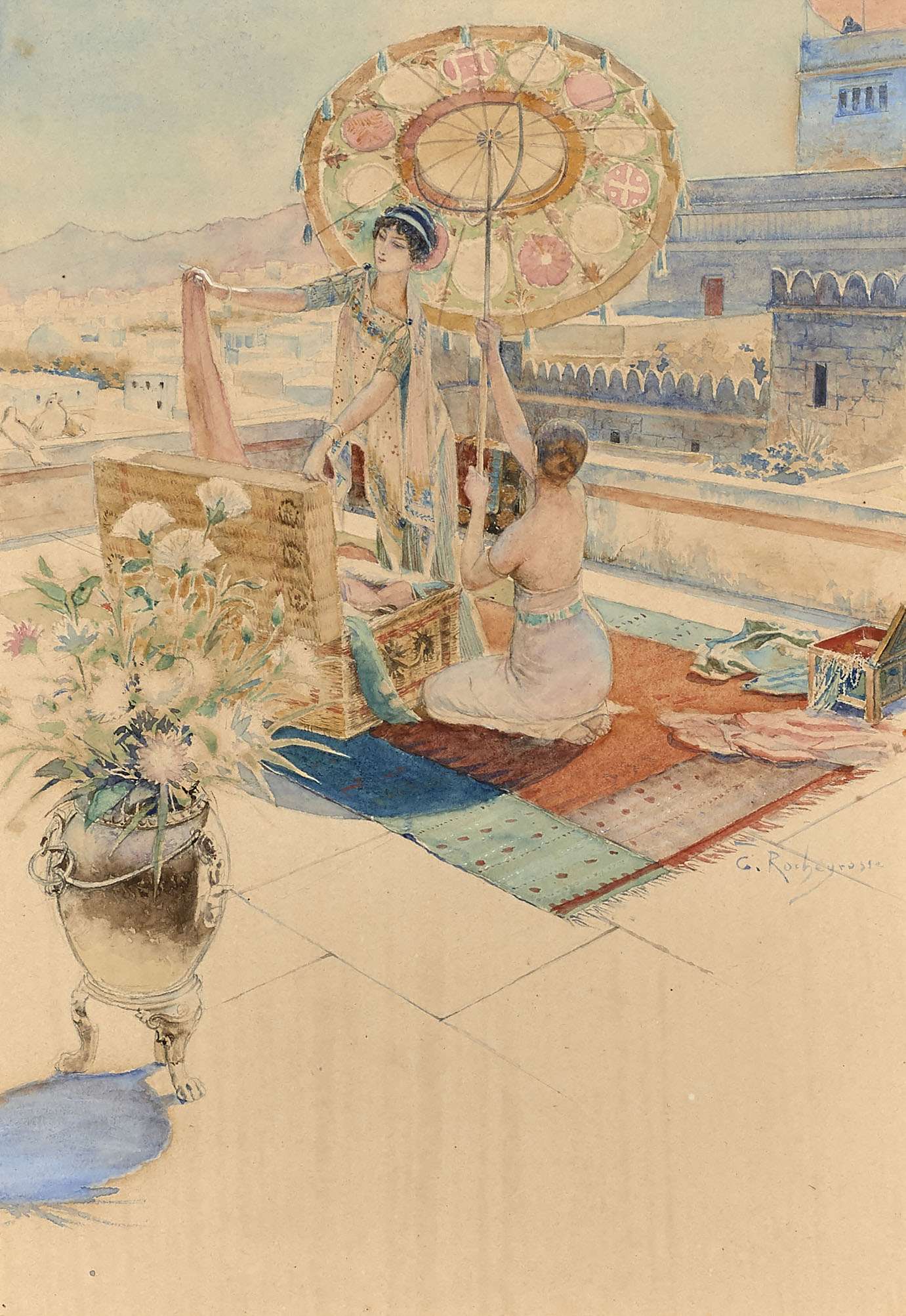 La confrontation de l’aquarelle et de l’huile sur toile montre que l’artiste, s’il a conservé globalement la scène principale, a par contre changé l’arrière-plan : d’une succession de toits et terrasses évoquant une ville médiévale arabe, le décor de la scène se transforme en cité imaginaire inspiré par des monuments et temples antiques. Cette transposition rappelle un procédé plutôt courant des orientalistes tels Gérôme etc, qui passaient avec une aisance remarquable, grâce à une solide érudition, de l’Antiquité romaine à l’Orient médiéval arabo-musulman.