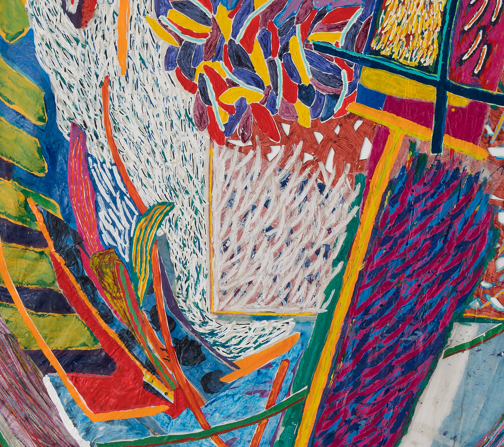 Déclinaisons issues des « Opéras », Les Mandylions, plus récents, renouent avec des références sacrées liées aux origines de la représentation picturale tout en s’inscrivant dans la lignée des papiers découpés d’Henri Matisse. A l’organisation complexe, ils témoignent d’une même exubérance à travers l’enchevêtrement des fines coulures de peinture et des imposantes formes découpées reportées en un léger décalage. L’opération de report, laissant visible la silhouette des formes découpées, joue sur les profondeurs de la peinture tout en mettant en relief le processus d’apparition des figures.