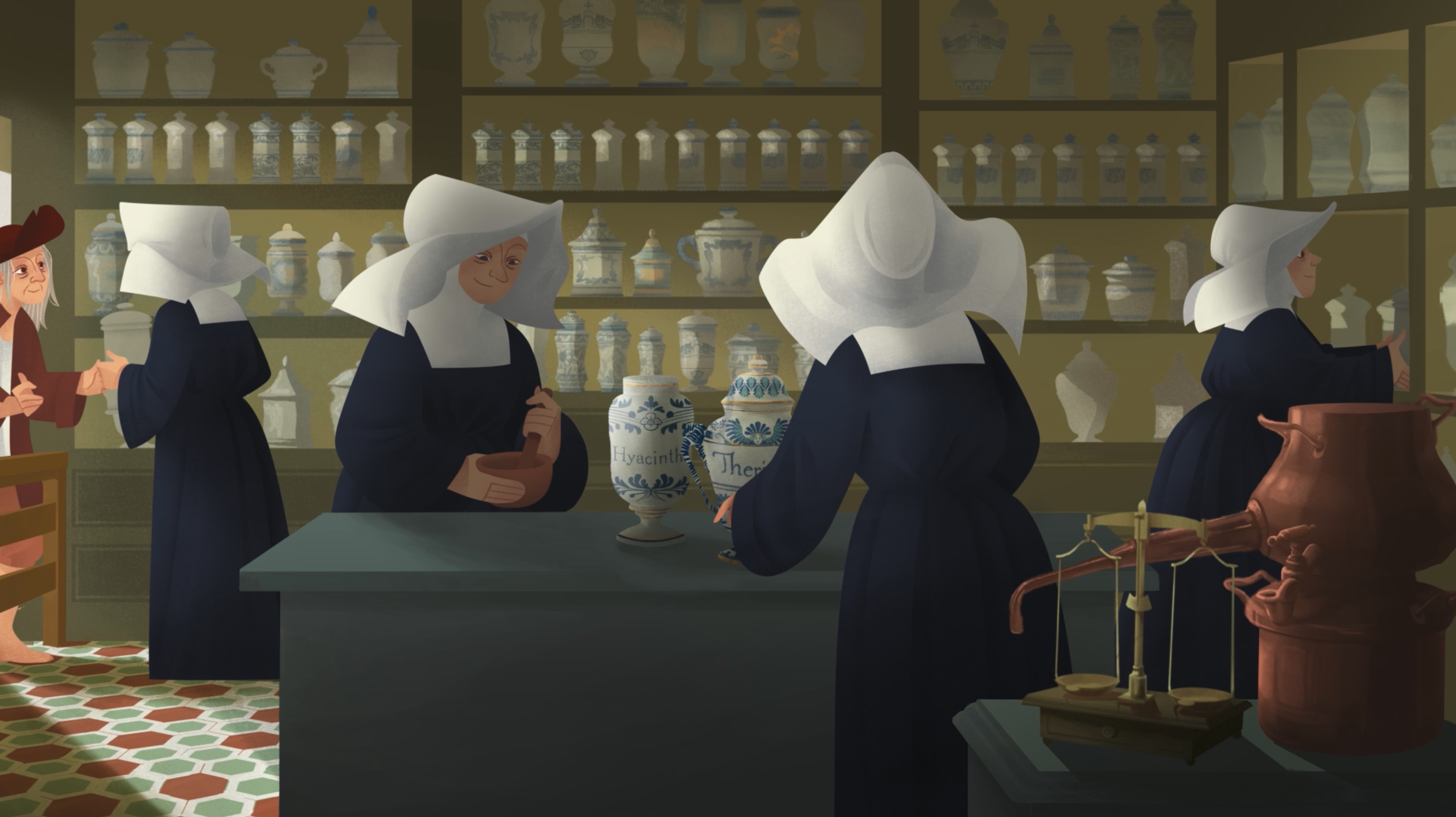 L’histoire de l’œuvre de la Miséricorde commence après le siège de la ville par Louis XIII en 1622 lorsque des femmes, soucieuses d’apporter aide et réconfort à une population éprouvée par les Guerres de Religion, se réunissent pour fabriquer le « bouillon » et l’apporter aux pauvres malades. Ces femmes, issues de l’aristocratie montpelliéraine et pour la plupart épouses ou filles de conseillers à la cour des comptes, aides et finances de Montpellier seront secondées par les Filles de la Charité de Saint-Vincent-de-Paul à partir de 1668. Dès lors, l’Œuvre développe ses activités : portage de repas et soins à domicile, distribution de vêtements, visite des prisonniers, alphabétisation des petites filles… L’installation rue de la Monnaie, dans la maison léguée par l’une d’entre elles, Anne de Conty d’Argencour, permet en 1718 à l’Œuvre de créer la pharmacie qui va fonctionner sous la houlette des sœurs jusque dans les années 1960.