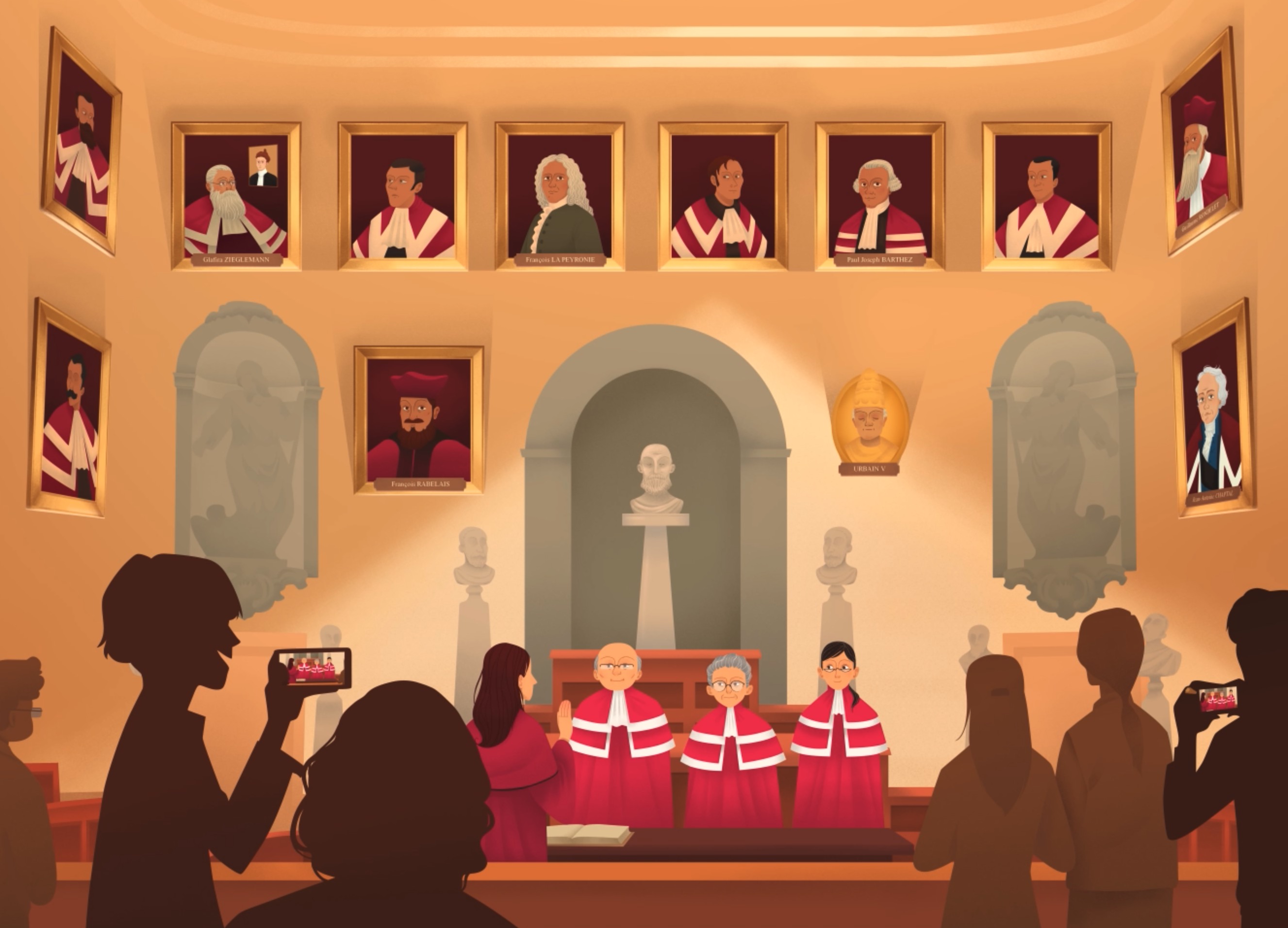 Les soutenances de thèse ont lieu dès lors dans la chapelle de l’évêché, au milieu de grisailles murales évoquant des évêques réformistes. Les professeurs s’habillent et délibèrent dans les appartements de l’évêque, entre des stucs muraux figurant le Christ et Marie !