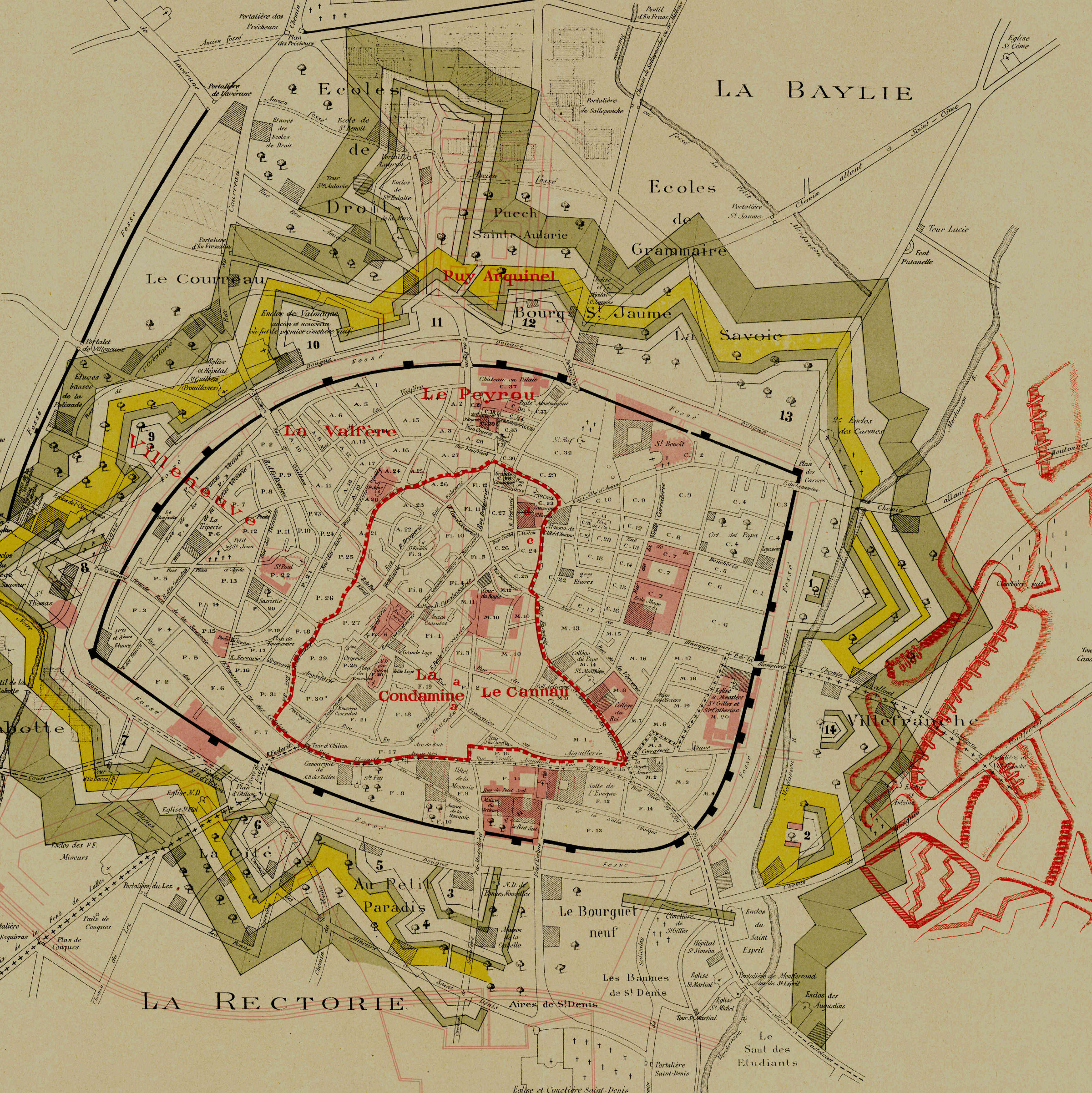 Plan des fortifications du siège de 1622 par Albert Vigié paru dans son étude « Des enceintes successives de la ville de Montpellier et de ses fortifications » (1898)Vigié utilise comme fond de carte le plan de La ville de Montpellier, ses enceintes et ses faubourgs au Moyen-Age de Louise Guiraud, truffé (en rose clair) des principales transformations du XIXe siècle. Ce plan permet de situer l’emprise approximative de l’enceinte bastionnée dans le tissu urbain actuel.AMM, 2Fi441