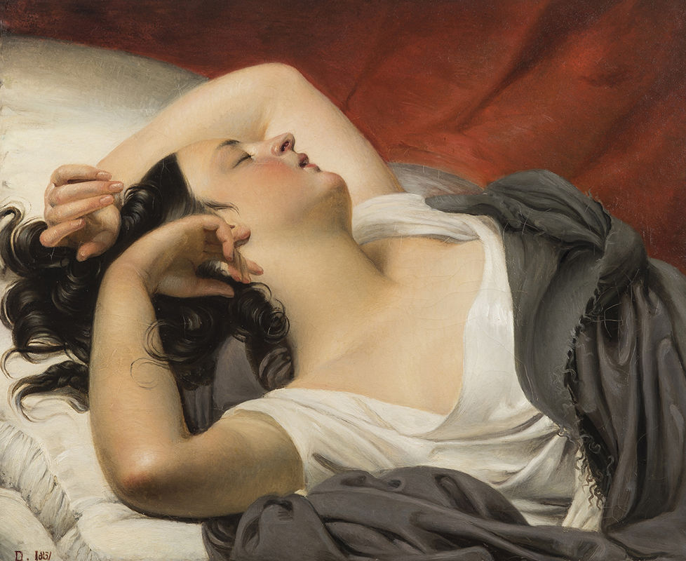 C’est au Salon de 1827 que Dubufe présente les quatre tableaux qui vont assoir sa réputation. D’une part Les Souvenirs et Les Regrets (Pasadena, Norton Simon Museum) et d’autre part Le Sommeil et Le Réveil. Notre tableau est une réplique du Sommeil peinte en 1831, dont on connait également trois autres versions. Les tableaux originaux du Salon de 1827 n’ont pas été localisés.