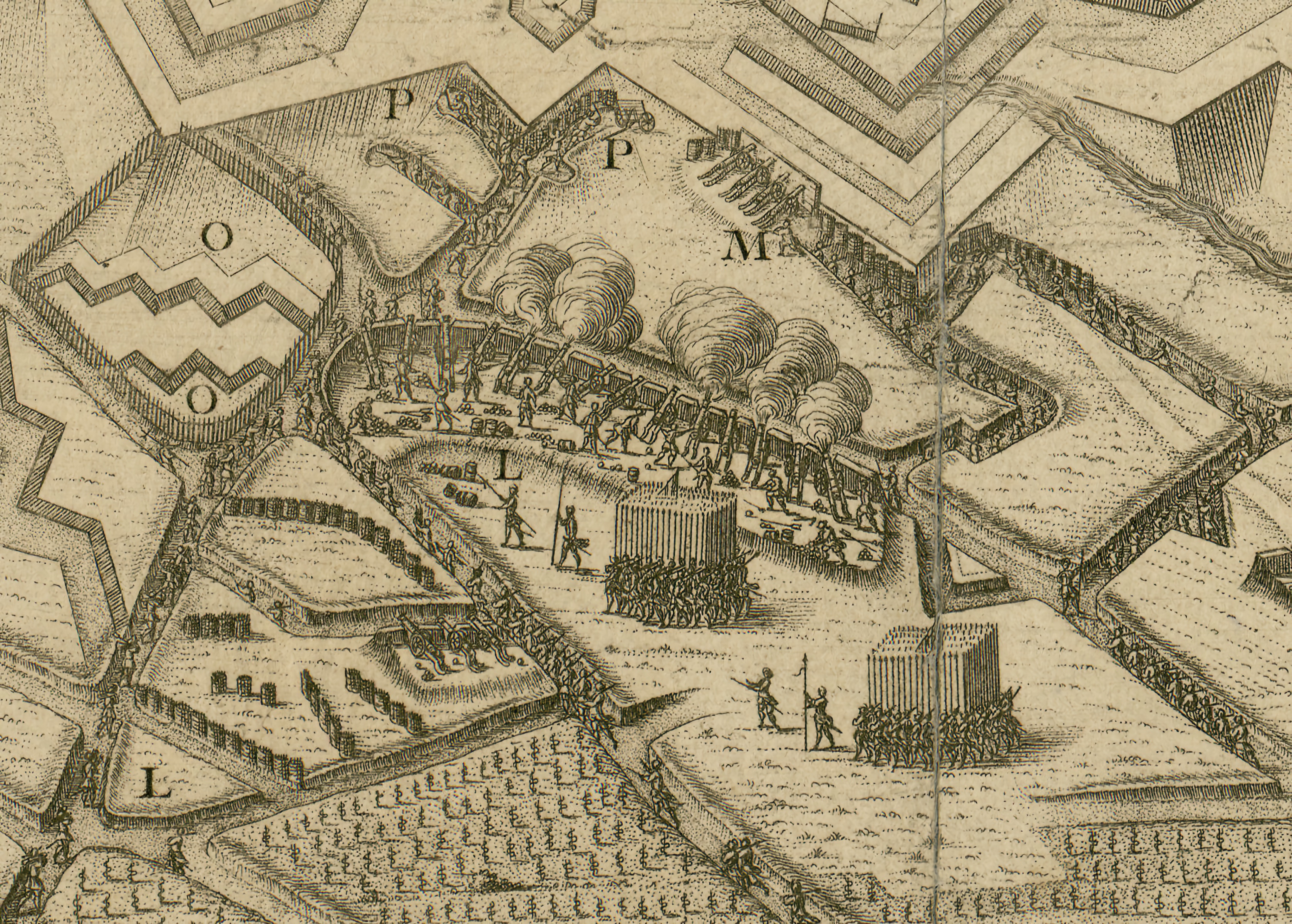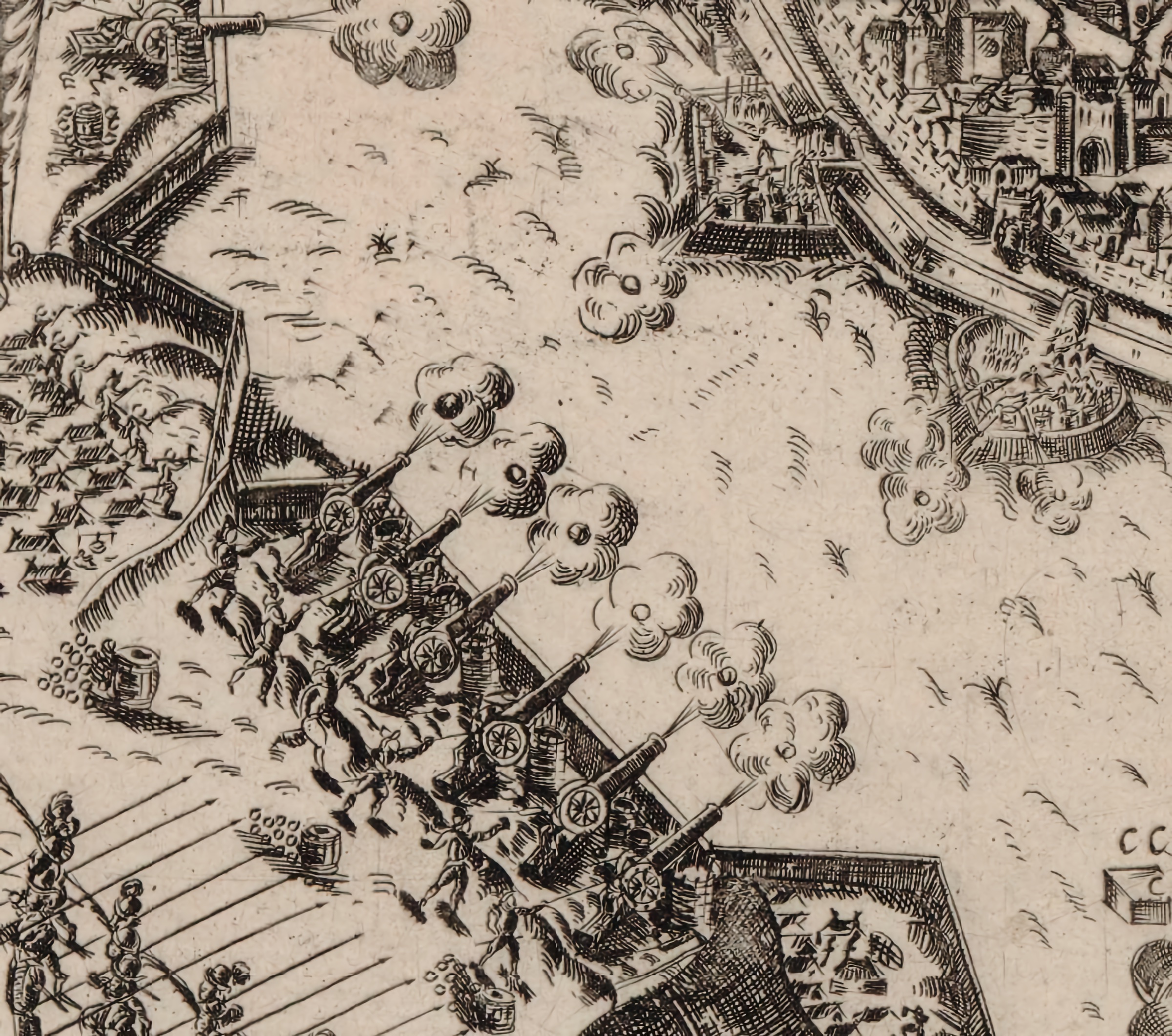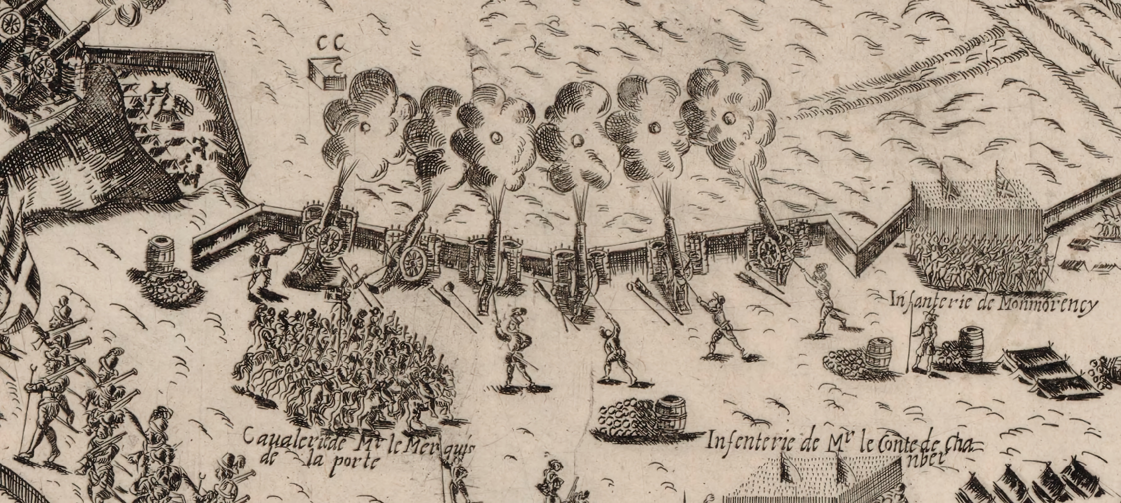 L’après-midi, Sa Majesté faisant le tour de la ville faillit à estre tué d’un coup de canon. C’eust esté un malheur extrême et une très grande affliction à ceux de dedans qui ne recognoissoient pas de loin que le Roy fust dans ceste troupe. Mais defent que ceux qui approchent de Sa Majesté empeschent qu’elle n’expose point sa personne sacrée à tant de périls.