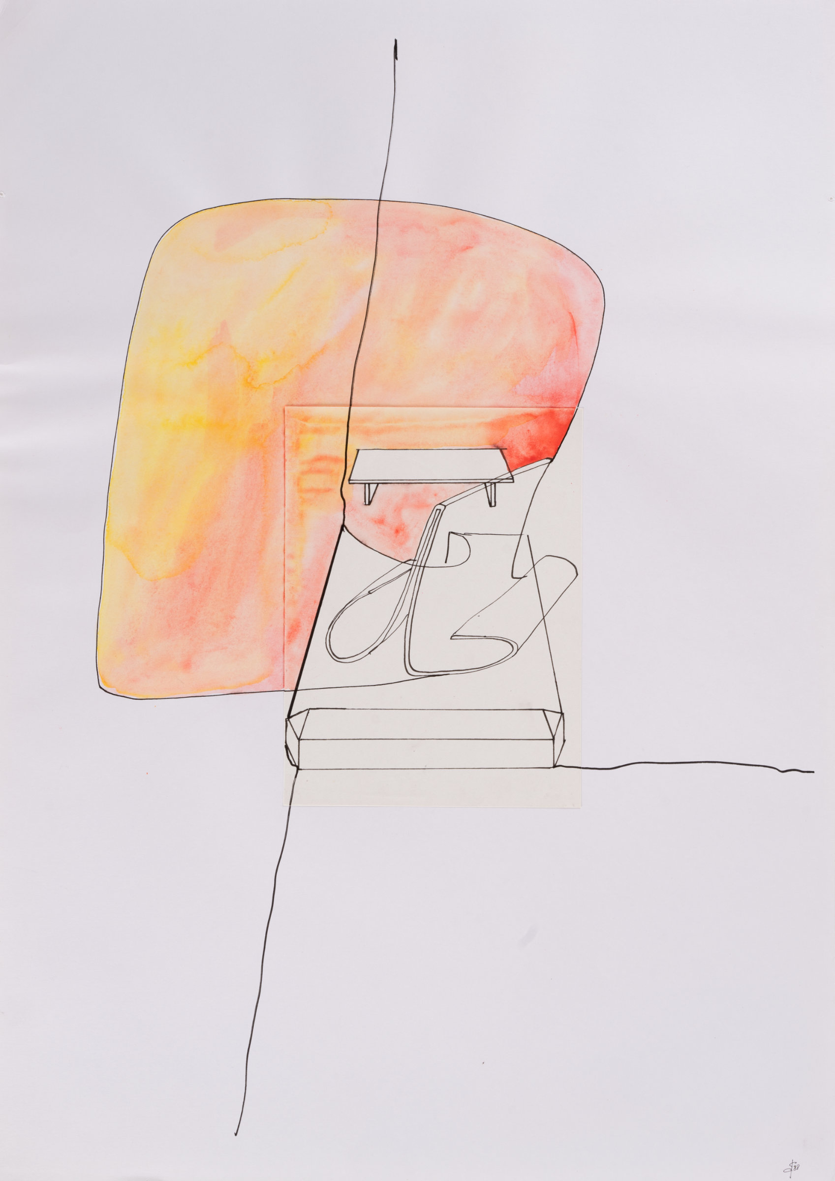 Alors que la plupart des dessins de Dominique Gauthier se développent dans les limites des formats standard de papier, « Les Opéras théâtres »1 qui accompagnent la fin des années 1970 sont parfaitement libres de se déployer autant que nécessaire, et seule peut-être la fragilité du support peut mettre un frein à la volonté expansive inhérente à l’œuvre. Le dessin de 1979 interroge diverses formes géométriques, entre vide et plein, lignes et traits estompés qui occupent sans le remplir l’espace intérieur. Des bandes courbes telles des grandes virgules, colorées à gros traits, viennent enserrer ou contrarier les deux formes initiales.