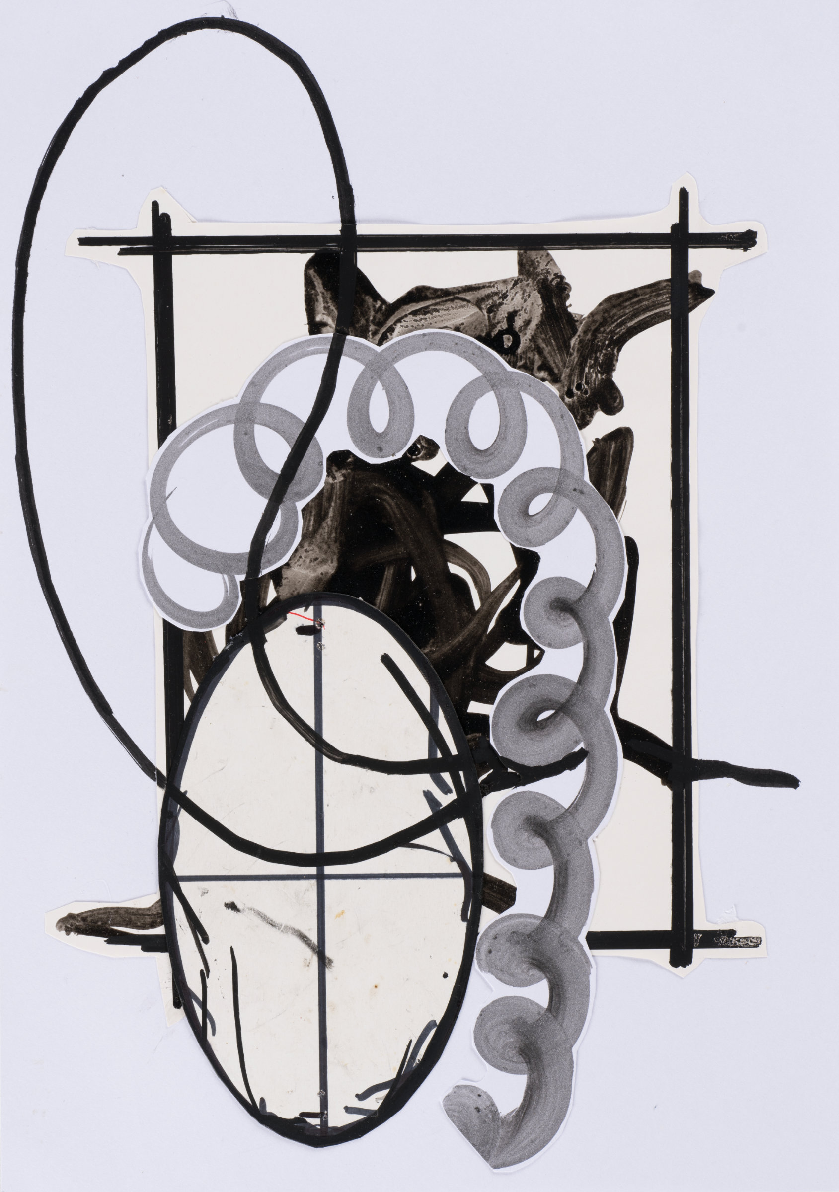 Le deuxième, réalisé en 1982, plus proche des « Opéras » de peinture dans sa monumentalité, profite du principe des collages pour s’émanciper et se multiplier dans une dynamique d’enjambements ronds accentuée par l’exubérance des bandelettes. Toutefois, une forme tranchante faite de triangles vient stopper ce mouvement prospère. Des dessins ajoutent des indications référentielles à l’acte en train de se jouer, comme l’envisage la promesse du titre.