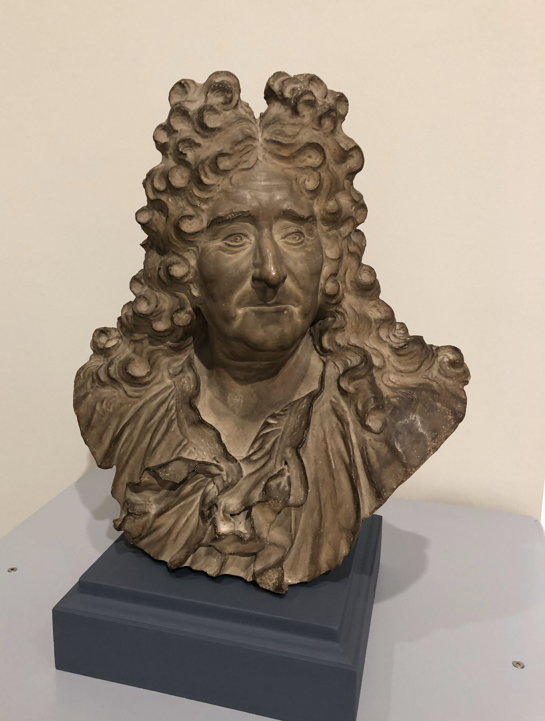 L'image représente un buste en sculpture, qui semble être en pierre ou en plâtre. Le buste a des cheveux bouclés et une expression sérieuse. Il porte un vêtement avec un col ouvrant, typique des styles du 17e ou 18e siècle. La sculpture est posée sur un socle gris, mettant en valeur les détails du visage et des cheveux. L'éclairage met en relief les traits du visage, soulignant la texture de la matière.