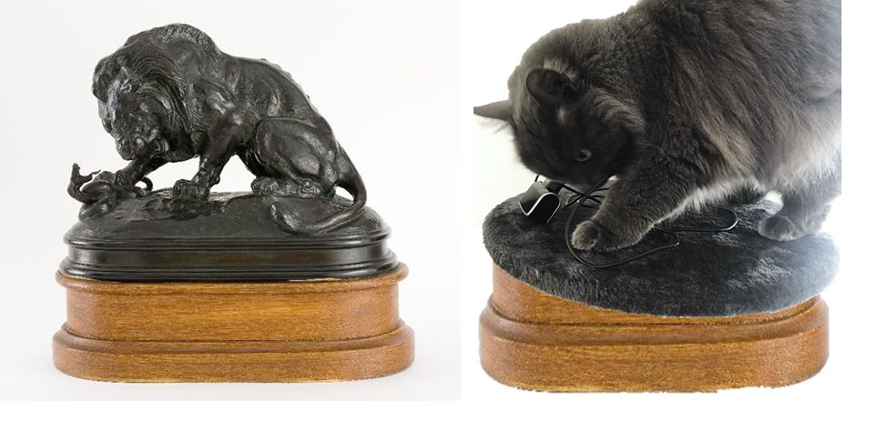 L'image montre un chat gris qui semble jouer ou interagir avec un objet noir ressemblant à des écouteurs. Le chat est posé sur une base ronde en bois, recouverte d'un matériau doux et moelleux. L'arrière-plan est flou, mettant en valeur le chat et l'objet avec lequel il est en train de jouer.